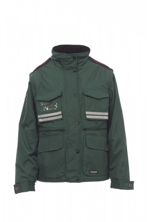 Дамска ергономична шуба, отделящи се ръкави, пластмасов цип от 8 мм с метален плъзгач с капак и пластмасови копчета, профилирана качулка, която се отделя и/или прибира в яката, регулиращи се маншети, сиви светлоотразителни ленти в предната и задна част, оформени лакти, странична цепка и цип, девет външни джоба, два от които са с LOCK-SYSTEM, два с цип и укрепена вътрешна част, един с реверсивен държач за бадж. Отвътре: с пълнеж, микрополар в областта на яката, гърба и бъбреците, дишащи елементи под мишниците, връзка в талията и вътрешен цип за лесно прилагане на ситопечат и бродерия.