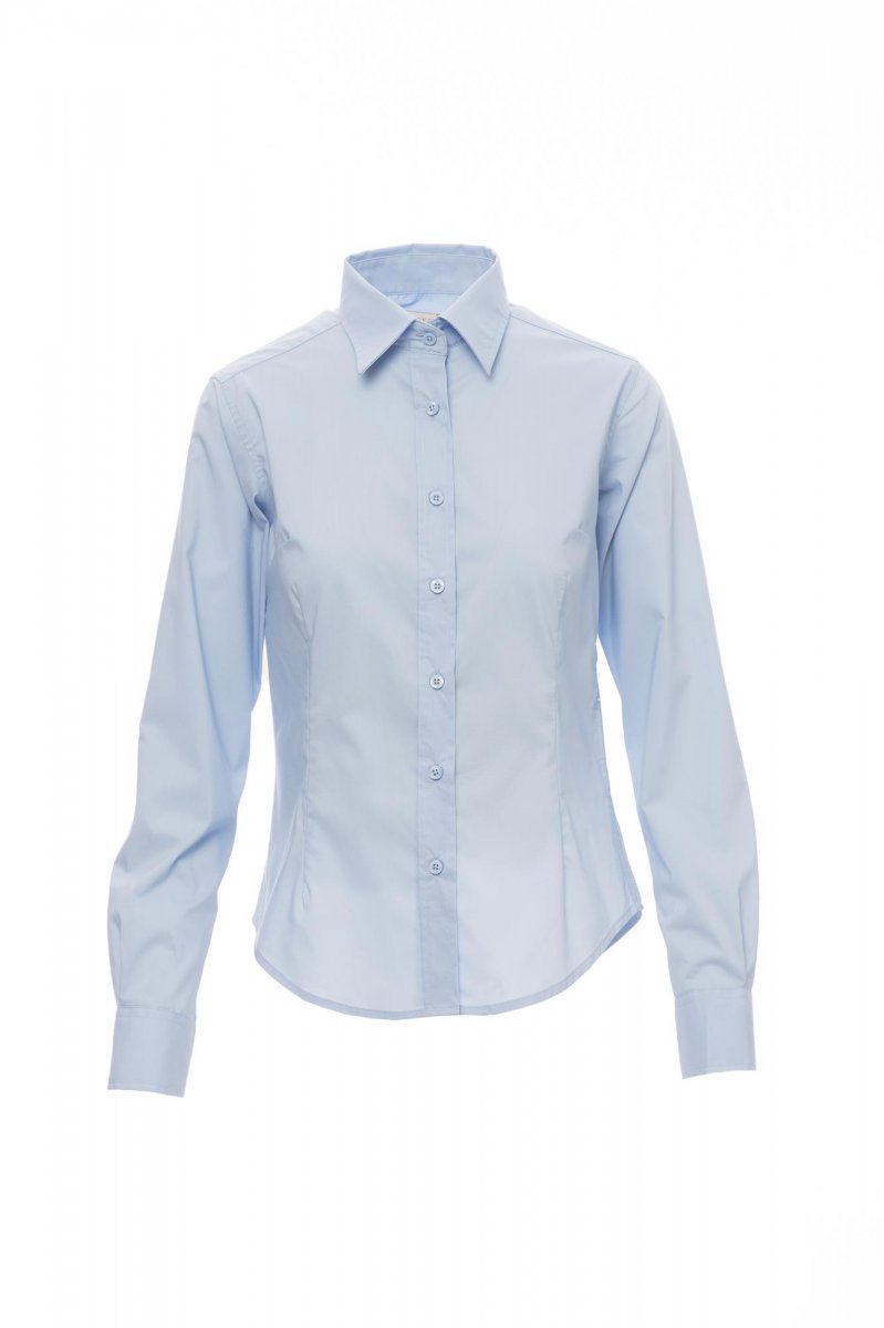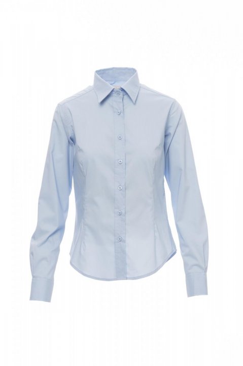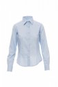 Дамска риза от пениран материал с фина плътност, втален силует, свивки отпред и отзад, яка в италиански стил, оформен маншет с две копчета и един илик, видим иличарник и копчета тон в тон; на гърба: гладка платка. Обработка за лесно поддържане на тъканта.