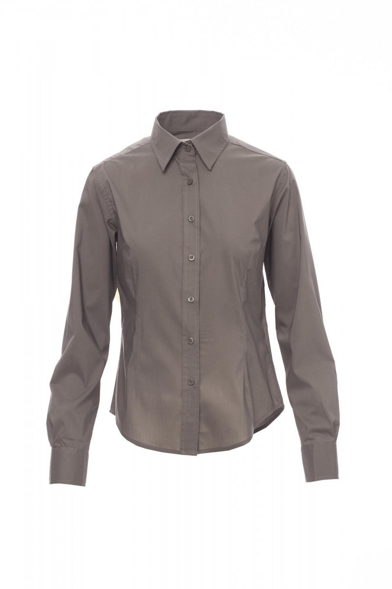 Дамска риза от пениран материал с фина плътност, втален силует, свивки отпред и отзад, яка в италиански стил, оформен маншет с две копчета и един илик, видим иличарник и копчета тон в тон; на гърба: гладка платка. Обработка за лесно поддържане на тъканта.