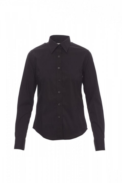 Дамска риза от пениран материал с фина плътност, втален силует, свивки отпред и отзад, яка в италиански стил, оформен маншет с две копчета и един илик, видим иличарник и копчета тон в тон; на гърба: гладка платка. Обработка за лесно поддържане на тъканта.