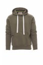 Мъжки суитшърт, качулка с двоен шев, бяла връзка, шевове с цвят на суитшърта и метални халки, реглан ръкав, декоративен V-образен шев на деколтето, джобове тип кенгуру, джобче с цип, ластични рипсени маншети и талия, укрепени шевове.