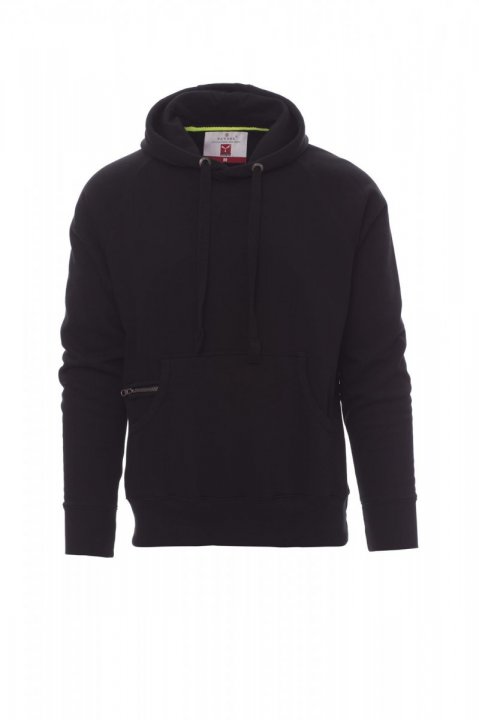 Мъжки суитшърт, качулка с двоен шев, бяла връзка, шевове с цвят на суитшърта и метални халки, реглан ръкав, декоративен V-образен шев на деколтето, джобове тип кенгуру, джобче с цип, ластични рипсени маншети и талия, укрепени шевове.