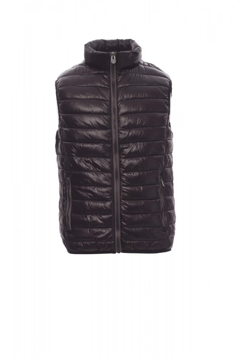 Мъжки елек с пълнеж от влакна в свободно състояние (160 g/m²), затваряне чрез пластмасов цип от 8 mm с метален плъзгач. Талия с фин кант. Два странични джоба с цип. Три вътрешни джоба.