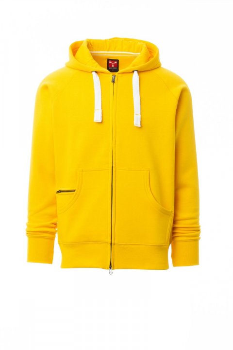 Мъжки суитшърт, цял SBS закрит цип, пластмасов, с двоен метален плъзгач, качулка с двоен шев, бяла връзка, шевове с цвят на суитшърта и метални халки, реглан ръкав, джобове тип кенгуру с джобче с цип, ластични рипсени маншети и талия. Подсилени шевове.