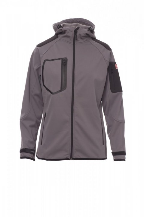 WP 8000 mm H₂O, WVT 5000 g/m² 24h. Дамски трислоен soft-shell, реглан ръкав, затваряне чрез цип SBS с топлинно залепена лента. Профилирана качулка с два шева и връзка, регулируема с ограничител. Регулируеми маншети с гумирани ленти за стягане на китката и самозалепваща лента. Фин борд на маншетите и в талията. Два странични джоба с цип, един джоб на гърдите и джоб върху лявия ръкав.