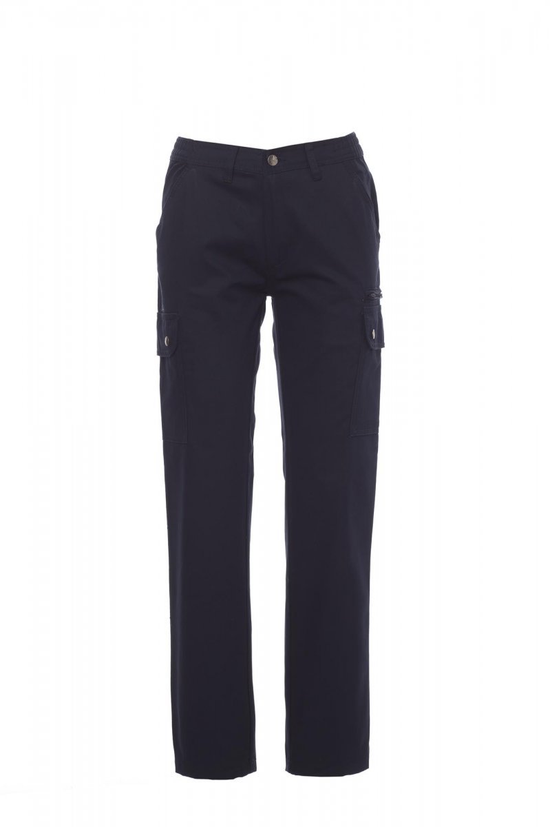 Дамски панталон, класически модел, за всички сезони, странични ластици и гайки на талията, затваряне с цип и метално копче, два класически предни джоба, два странични джоба с капак и автоматични копчета, един джоб с цип от лявата страна, скрит джоб за метър от дясната страна, два задни джоба-филетка с илик и копче.