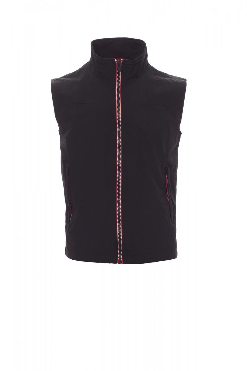 Мъжки елек, контрастен цип от 8 мм, два външни джоба с покрит цип. Отвътре: без пълнеж, с мрежа, един джоб с цип и предразположение за слушалки и кабел за смартфон на гърдите, и един в долната част за лесно прилагане на ситопечат и бродерия.