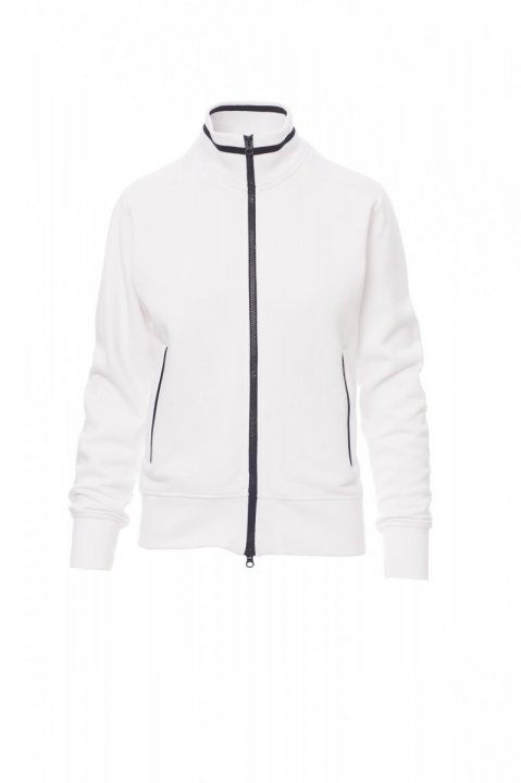 Дамски втален суитшърт, цял SBS цип, пластмасов, в контрастиращ цвят, с двоен метален плъзгач. Ластична рипсена яка с контрастен профил и на страничните джобове, ръкави с кръгла извивка, два външни джоба с ципове в контраст, ластични рипсени маншети и талия. Укрепени шевове.