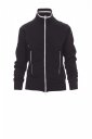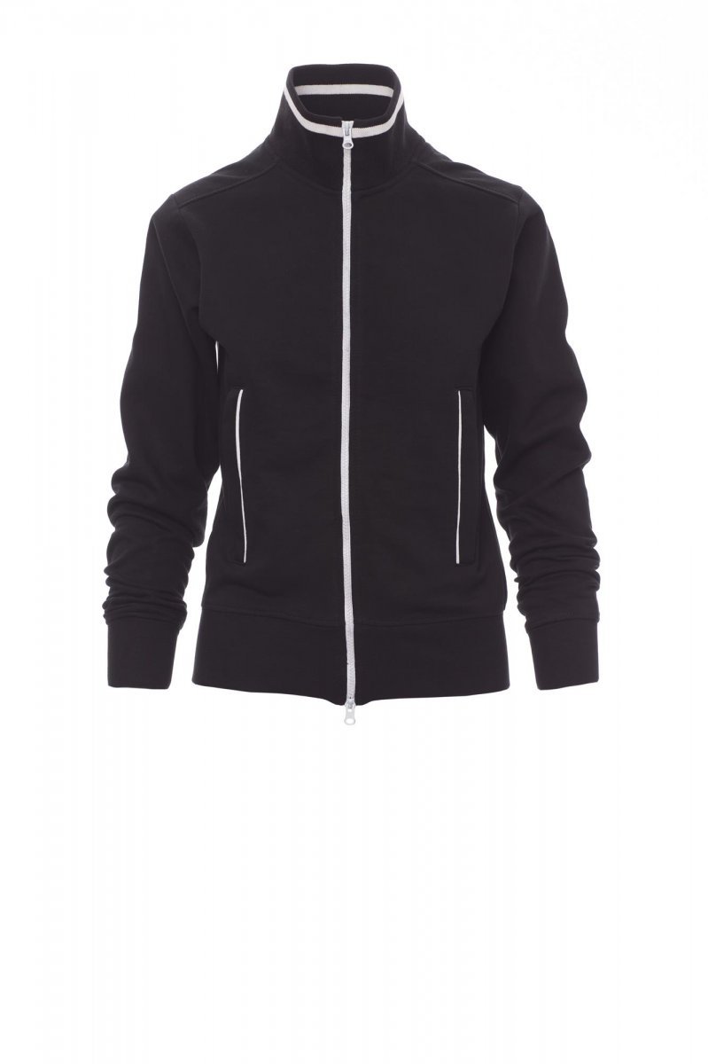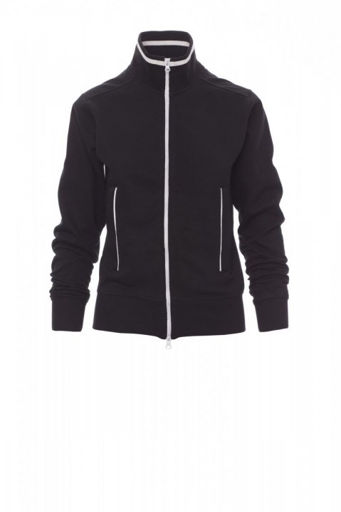 Дамски втален суитшърт, цял SBS цип, пластмасов, в контрастиращ цвят, с двоен метален плъзгач. Ластична рипсена яка с контрастен профил и на страничните джобове, ръкави с кръгла извивка, два външни джоба с ципове в контраст, ластични рипсени маншети и талия. Укрепени шевове.