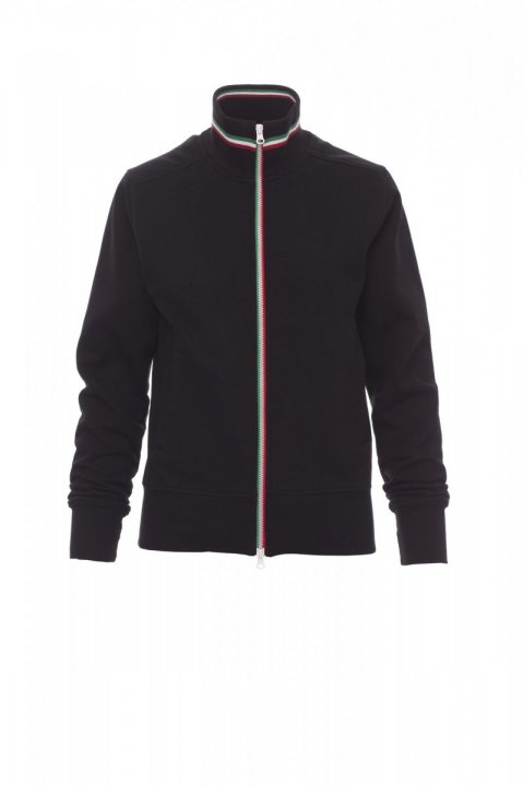 Дамски втален суитшърт, цял SBS цип, пластмасов, с контрастен трикольор и двоен метален плъзгач, ластично рипсено деколте с контрастен трикольор, ръкави с кръгла извивка, два външни джоба, затворени с цип, ластични рипсени маншети и талия, укрепени шевове.
