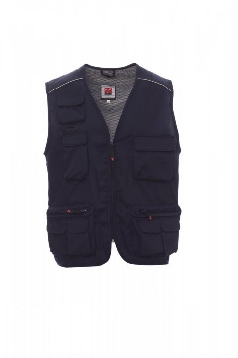Летен елек, цип, многоджобна комбинация в предницата, горен ляв джоб с реверсивен държач на бадж и светлоотразителен детайл, светлоотразително обточване в раменете и гърба, широк заден ловджийски джоб. Отвътре: под-плата от dry-tech, в контрастен цвят, отворена за лесно прилагане на ситопечат и бродерия.