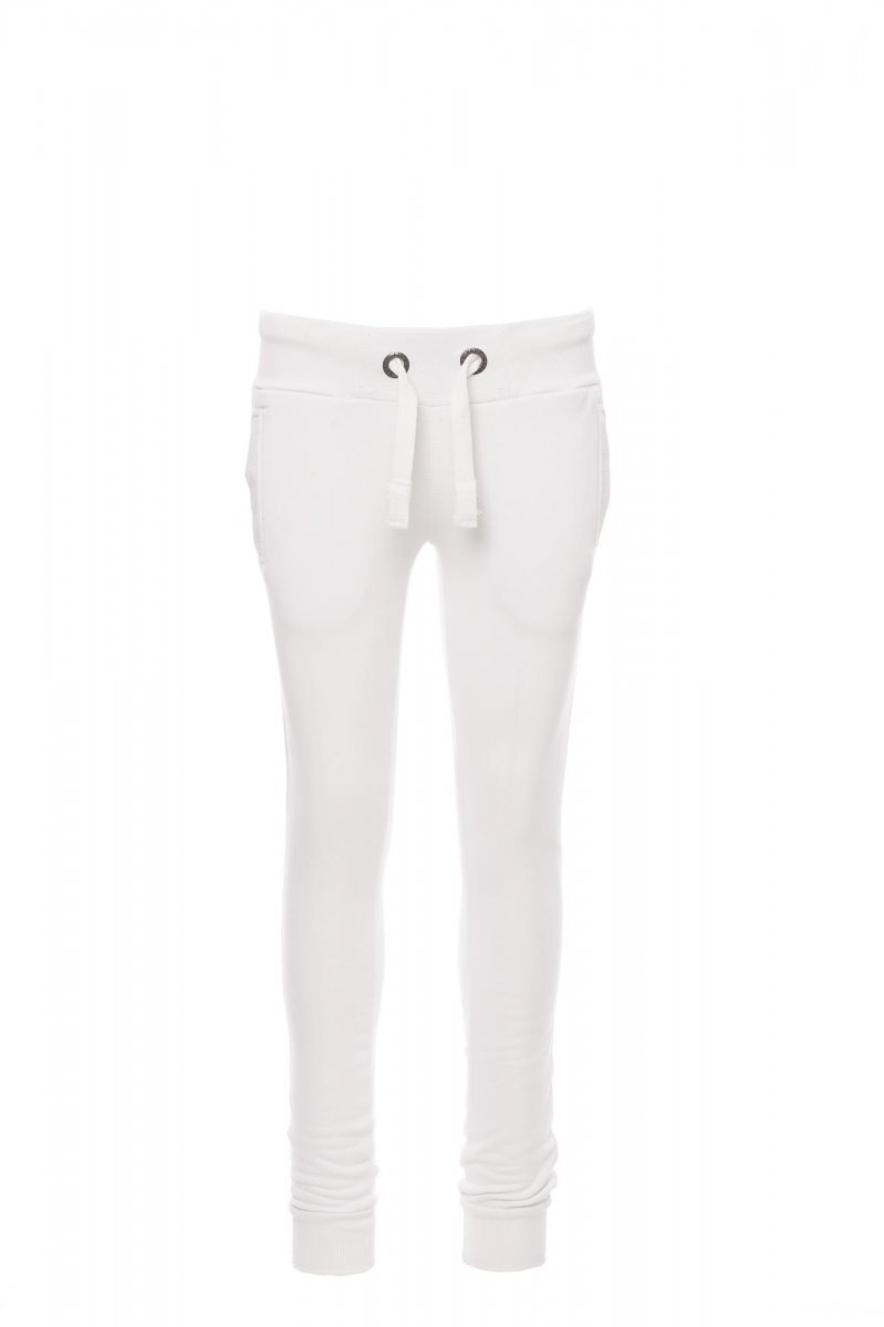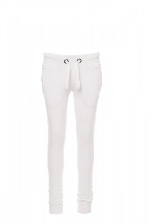 Дамски трикотажен панталон, ластичен рипсен колан в талията и долната част на шлиц, бяла връзка с контрастиращи шевове и метални халки, два рипсени предни джоба и укрепени шевове.