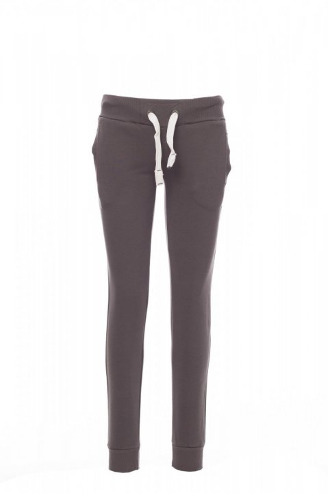Дамски трикотажен панталон, ластичен рипсен колан в талията и долната част на шлиц, бяла връзка с контрастиращи шевове и метални халки, два рипсени предни джоба и укрепени шевове.