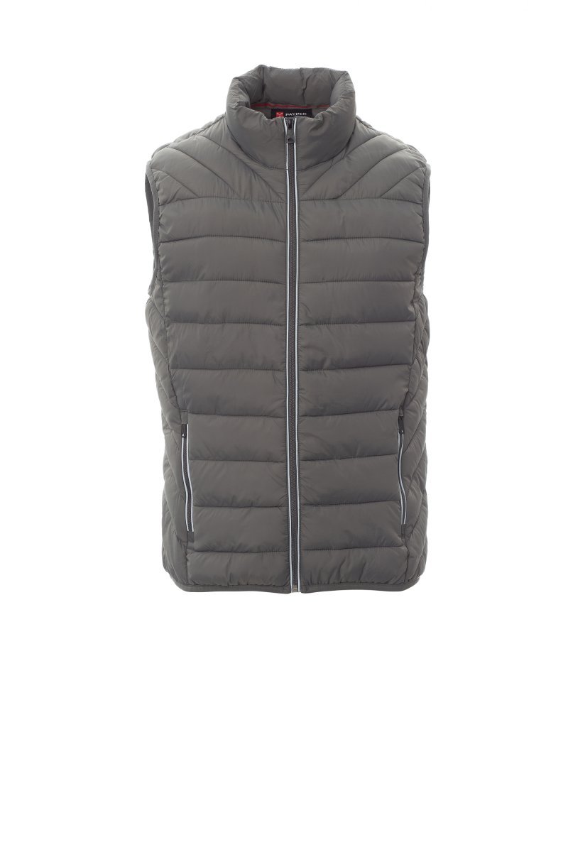 Мъжки елек с пълнеж от свободни влакна (160 g/m²), затваряне чрез пластмасов цип от 5 mm с метален плъзгач. Талия с фин кант. Два външни джоба с цип. Светлоотразително обточване на ципа. Два вътрешни джоба.