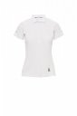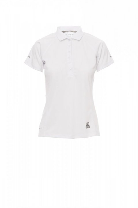 Дамска поло тениска от плат dry-tech, вталена, с къси реглан ръкави, шест копчета в еднаква форма, двойни странични шевове за по-добро прилягане, оформен подгъв и по-дълга задна част, светлоотразителна вложка на ръкавите и задната част на врата, контрастна лента на врата, етикет за трансфер.