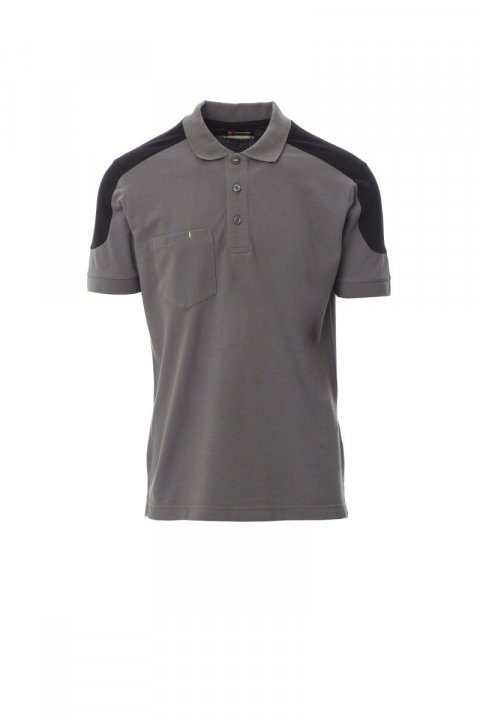 Двуцветна поло риза с къс ръкав с 3 копчета от същия цвят, джобче на гърдите с държач за химикалка, рипсен борд на ръкава, странични цепки, покрити шевове за яката.