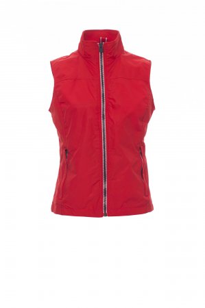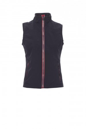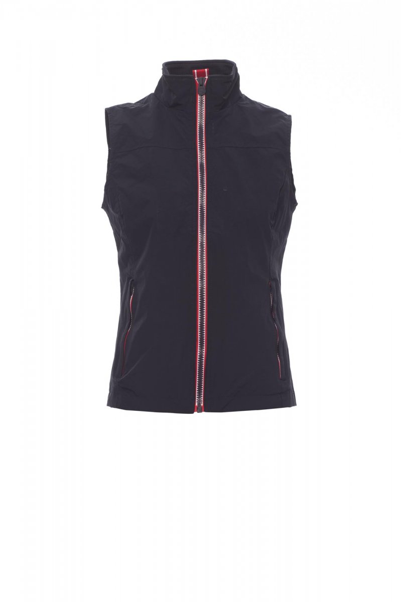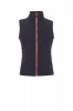 Zenski prsluk ergonomskog dizajna s patentnim zatvaračem od 8 mm u kontrastu, dva vanjska džepa sa skrivenim patentnim zatvaračem, s unutrašnjosti bez ispune i mrežastom postavom, jednim džepom za mobilni telefon sa zatvaračem i otvorom za slušalice te patentnim zatvaračem na grudima i leđima radi lakšeg štampanja i vezenja.
