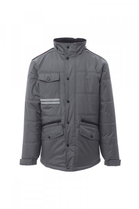 Muška jakna (3/4) s plastičnim patentnim zatvaračem od 8 mm s metalnim klizačem s preklopom i plastičnim dugmadima, formiranim zadnjim dijelom i kapuljačom sklopivom u okovratnik, dva vanjska džepa s patentiranim sistemom zatvaranja „LOCK SYSTEM”, dva džepa s patentnim zatvaračima, nakrivljenim džepovima za jednostavniji pristup, jednim džepom na prsima za pametni telefon i držačem za značke, reflektujućim trakama na džepu i leđima. Unutrašnjost: podstavljena, flis različite boje na leđima i vratu, džep, unutarnji patentni zatvarač za lakše postavljanje otisnutih grafika i vezenog materijala.