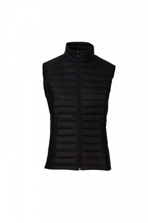 Ženski podstavljeni prsluk (120g/m²), bokovi od materijala soft-shell, plastični patentni zatvarač s metalnim klizačem sa funkcijom poluautomatskog zatvaranja i personalizovanim izvlakačem, dva bočna džepa s patentnim zatvaračem.