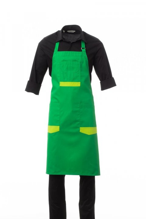 Uniseks pregača, višenamjenska, s tregerom koji se namješta kopčom, izrađena od polipamučne tkanine. Ima džep na oblikovani grudima s preklopom i dva džepa u struku, od kojih jedan ima držač za olovke. Ojačanje na dnu džepa, u kontrastnoj boji osim crne boje. Dimenzije: 80 x 90 cm.