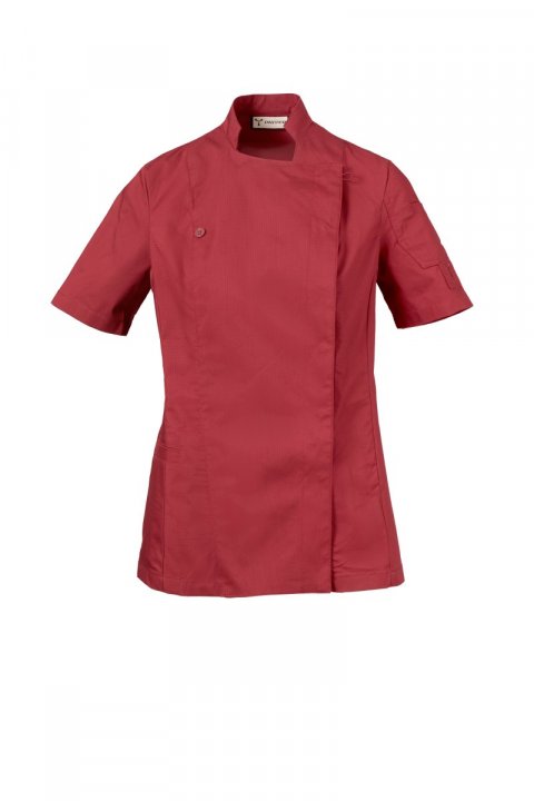 Kuvarska jakna s korejskim okovratnikom, izrađena od nepoderivog pamučnog materijala i materijala Lycra® T400®, s izvrsnim elastičnim i prozračnim svojstvima i s udobnom mrežastom tkaninom na leđima kako bi se povećala prozračnost. Dvostruko kopčanje dugmadima, preklopom i pričvršćivanjem na grudima pomoću vidljivog kopčanja dugmadima, što stvara efekat krojačkog revera i inovativnog V-izreza. Kratki rukav s porubom. Zakrpa u obliku ikone na lijevom ramenu, s izvezenim spiralama u nijansi, opremljena džepom za olovke. Praktičan džep za pametni telefon u struku.