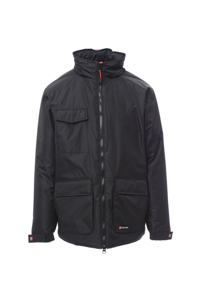 Tříčtvrteční pánská bunda, 8mm plastový zip s kovovým jezdcem, kapuce v límci, elastický pásek a stahovací pásky na zápěstí, dvě velké přední kapsy s LOCK SYSTEMem, dvě postranní kapsy, jedna kapsa na hrudi na mobilní telefon. Vnitřek: zateplení, zip pro snadnější potisk a vyšívání.