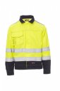 Nezateplená bunda, přední zapínání na plastové knoflíky a klopu; zapínání manžet na knoflík, stahovací pásek na suchý zip, kontrastní prošití, jedna kapsa na smartphone, jedna kapsa na odepínací pružné pouzdro na jmenovku a očko na tužku na kapse na hrudi s klopou na suchý zip. Vyštíhlený džínový střih. Vnitřek bez podšívky.