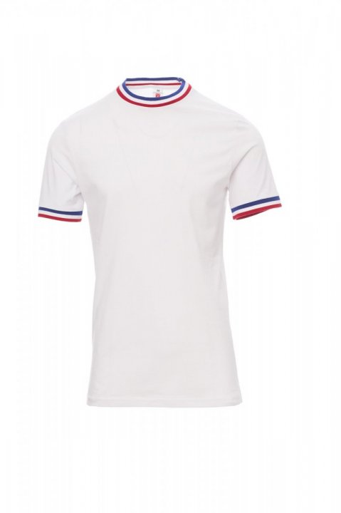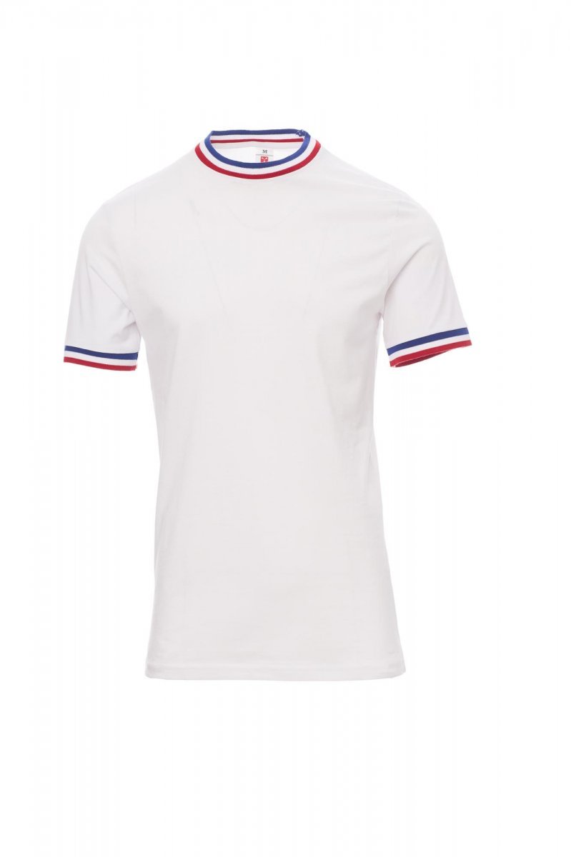 Kortærmet T-shirt med rund hals til mænd, kontrasterende krave og ærmekant (flagfarver) 2,3 cm spandex mix rib nakkebånd med kantsyning foran, skulder til skulder-forstærkningsbånd. Elastiske sømme, sidesømme