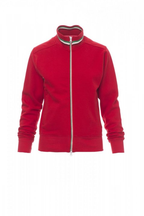 Sweatshirt til kvinder, med hel, kontrasterende trefarvet SBS plastlynlås med dobbelt metalskyder, ribkrave med kontrasterende trefarvet bort, kropsnære ærmer, to udvendige lommer lukket med lynlås, strækribmanchetter og -søm, forstærkede sømme.