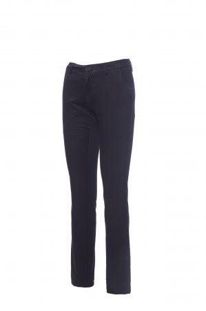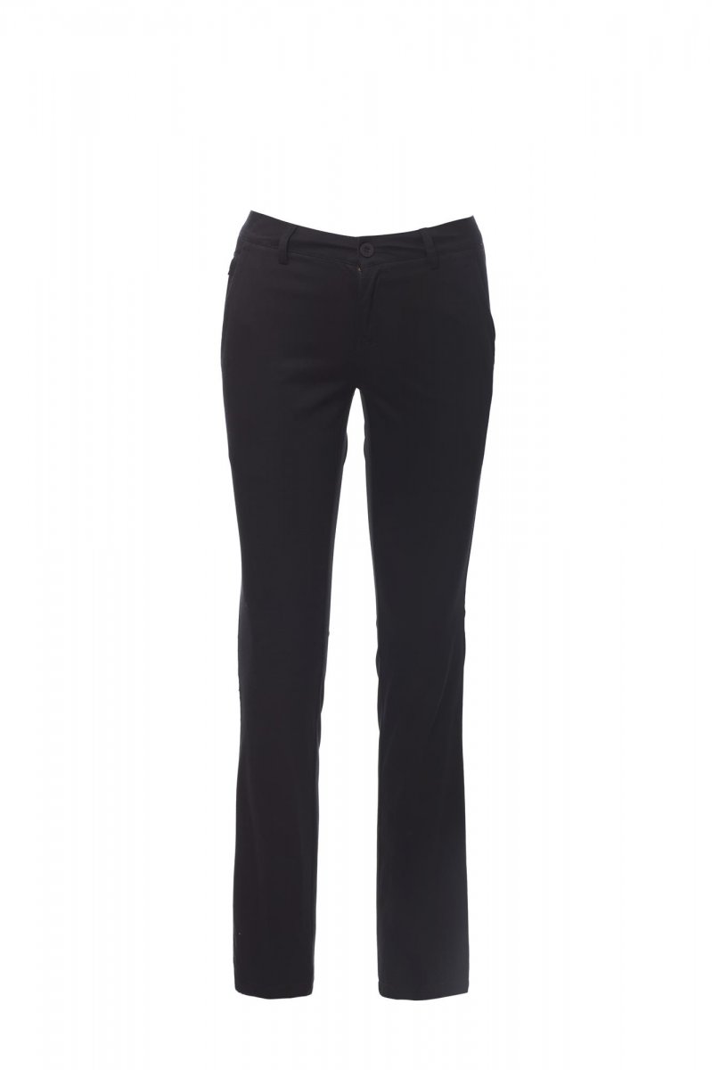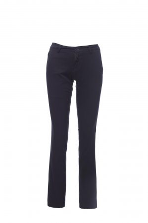 Klassiske bukser til kvinder, med franske lommer, en lille lynlåslomme, to slidslommer bagpå med knap, lynlåslukning med knap, bæltestropper i taljen og lap i ægte læder, i kæmmet bomuld i to lag med høj tæthed og enzymvask.