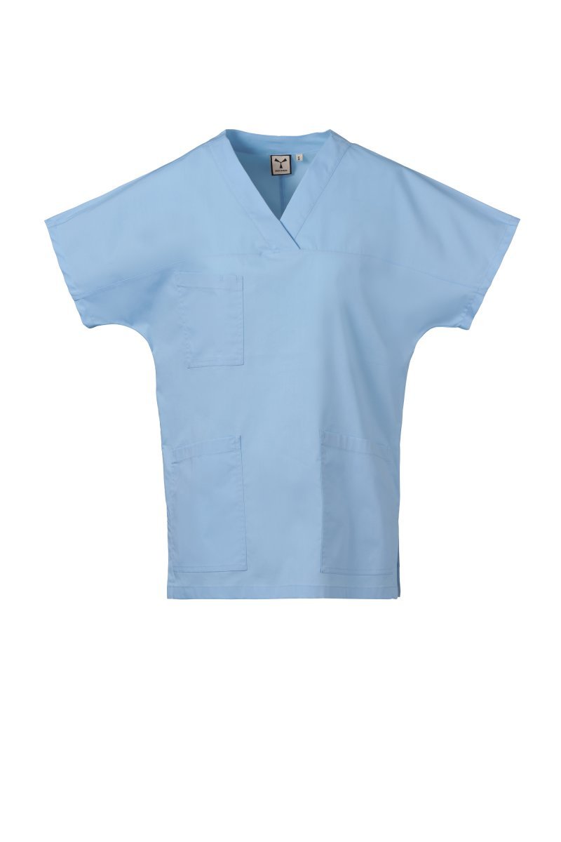 Kortærmet arbejdstunika med V-udskæring, lavet af bomuldspoplin, polyester og Lycra® T400®, med fremragende elastiske og åndbare egenskaber. Vandret syning foran. Brystlomme med kuglepensrum. To store påsyede lommer nederst. Ryg med midtersyning. Sideslidser giver større bevægelsesfrihed.