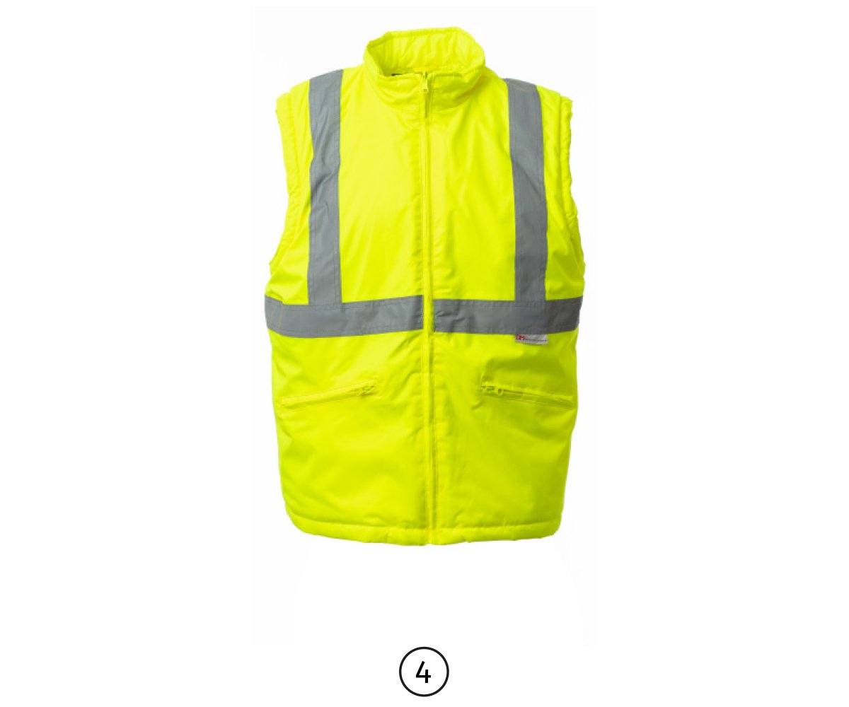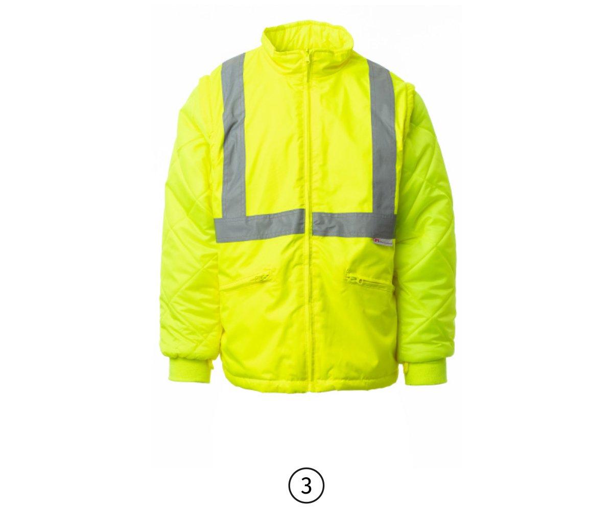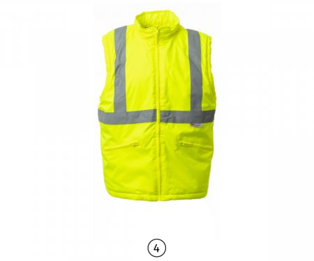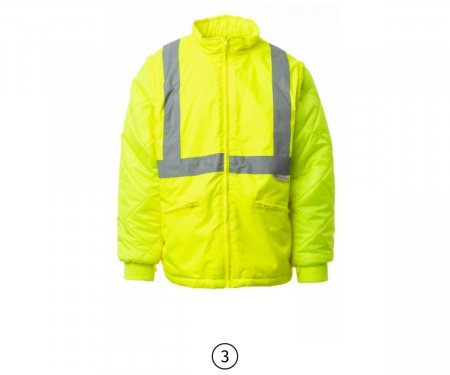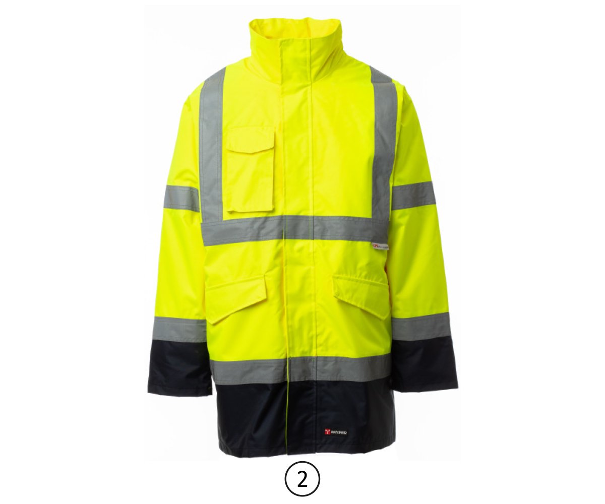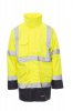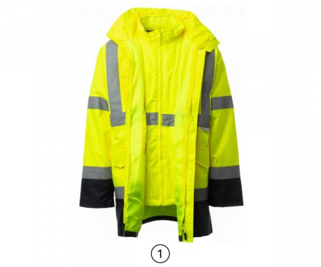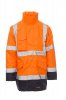 Zweifarbiger 4-in-1-Parker für hohe Sichtbarkeit: ungefütterte Außenjacke, verdeckter Reißverschluss aus Kunststoff mit Klettverschluss, im Kragen einrollbare Kapuze, Kugelärmel. 2 Vordertaschen mit Patte und Klettverschluss: rechte Brusttasche mit Klettverschluss, Handytasche und Ring an der Innenseite zum Anhängen eines Ausweises; 1 Innentasche mit Klettverschluss. Zwei Streifen rund um Brust, Schultern und Ärmel. Warmversiegelte Nähte. Herausnehmbare, wattierte Innenjacke mit abtrennbaren Ärmeln, Reißverschluss aus Kunststoff, Ärmelbündchen aus elastischem Feinripp, 2 Vordertaschen mit Reißverschluss, 1 Innentasche mit Reißverschluss, ein Streifen rund um Brust und zwei vertikale Streifen an den Schultern.