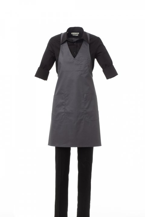 Ποδιά γιούνισεξ, πολυλειτουργική, με σαλοπέτα V ντεκολτέ, μπορεί να ρυθμιστεί με 2 κουμπιά στο πίσω μέρος του λαιμού, υλοποιημένη με twill βαμβακερό και Lycra® T400®, με εξαιρετικές ιδιότητες ελαστικότητας και διαπνοής. Έχει τσεπάκι για στυλό στην αριστερή πλευρά του στήθους και δύο τσέπες τοποθετημένες στη μέση. Μεγέθη: 70x65cm.