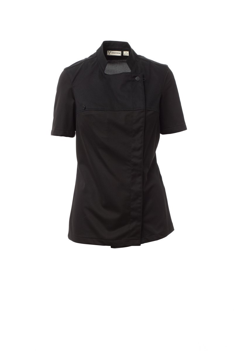 Σακάκι μαγείρισσας με γιακά μάο, υλοποιημένο με twill βαμβακερό και Lycra® T400®, με εξαιρετικές ιδιότητες ελαστικότητας και διαπνοής και με ευχάριστο στην υφή δικτυωτό ύφασμα για πλάτη μανίκια και μέση, για ενίσχυση της διαπνοής. Σταυρωτό κλείσιμο με αυτόματα κουμπιά, πέτο που αναδιπλώνει και στερεώνεται στο στήθος με κούμπωμα ενός ορατού κουμπιού, που δημιουργεί το εφέ κολάρου υψηλής ραπτικής και ένα καινοτόμο V ντεκολτέ. Κοντό μανίκι με στρίφωμα.
