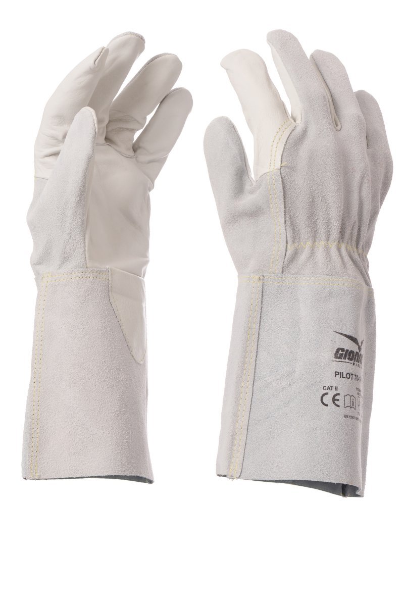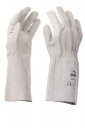 Γάντι για συγκολλητές με παλάμη και δείκτη από μη αποψιλωμένο δέρμα βοοειδών, ράχη από ακατέργαστο δέρμα βοοειδών και μανσέτα 14 cm από ακατέργαστο δέρμα βουβάλου. Προστασία φλεβών από μη αποψιλωμένο δέρμα βοοειδών και λάστιχο που σφίγγει στον καρπό. Ραφές με νήμα από ίνες παρα-αραμιδίου. Χαρακτηριστικά: μαλακό, γερό, ανθεκτικό. Πλεονεκτήματα: άνεση, δεξιότητα. Πεδία χρήσης: κατάλληλο για χειρισμό βαριών, αιχμηρών, σκληρών, τραχιών, και θερμών αντικειμένων, για καθαρισμό εγκαταστάσεων, ξυλουργικών και μεταλλικών δομικών κατασκευών, εργασίες συγκόλλησης. Ελάχιστη μονάδα πώλησης: 1 δωδεκάδα (12 ζευγάρια).