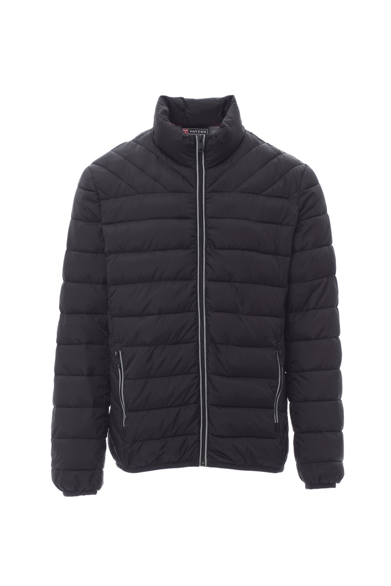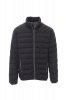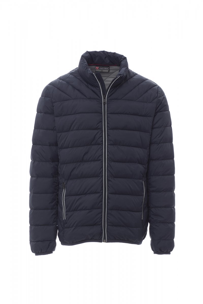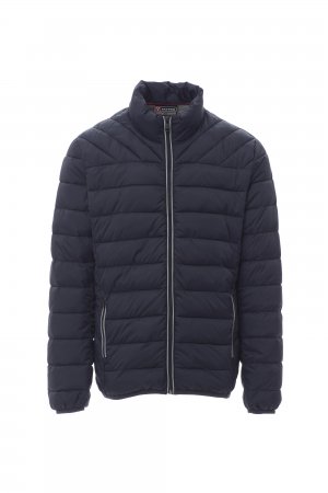 Men's down jacket with free-fibre padding (160g/m²), 5mm plastic zip with metal slider. Thin piping on cuffs and waist. Two external pockets with zip. Retroreflective piping on the zip. Two internal pockets.