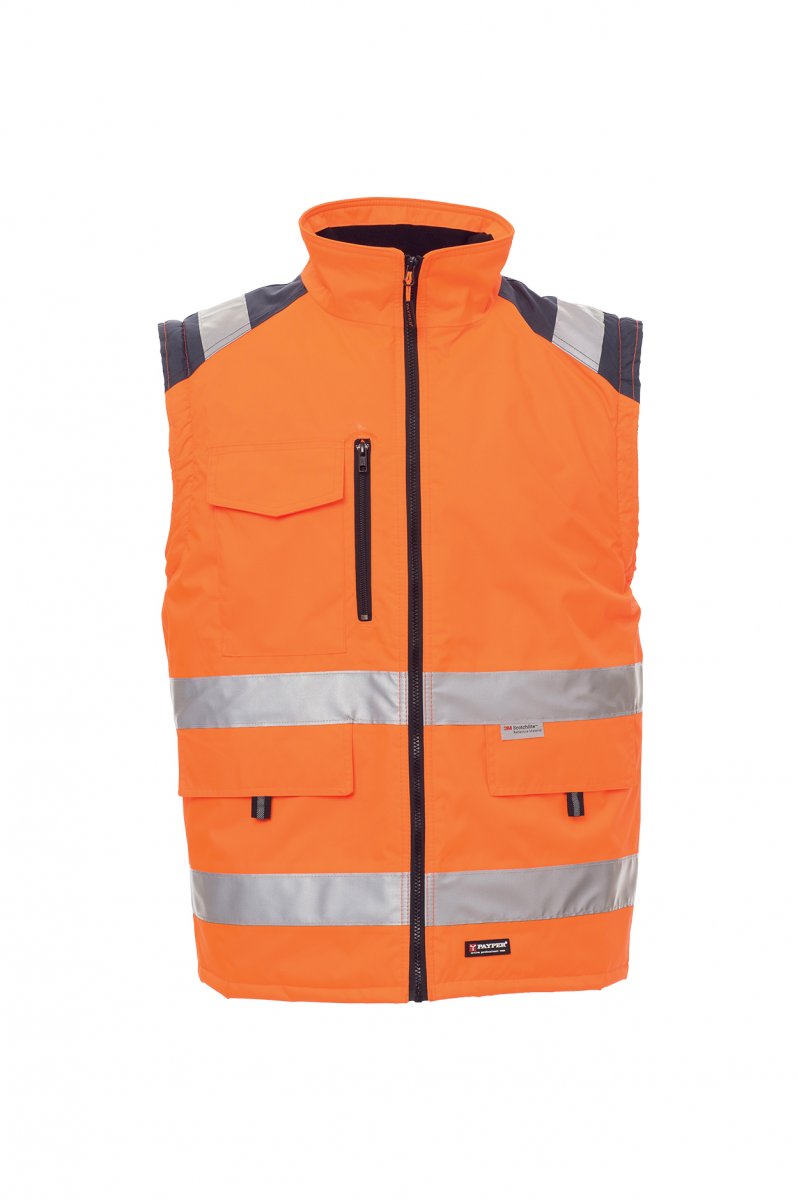 Two-tone, high visibility jacket with retroreflective stripes, opening with plastic zip with metal pull, detachable inset sleeves, elasticated cuffs, two front pockets with flap and Velcro, one breast pocket with flap and Velcro, foldaway badge holder and smartphone holder and side zip in contrasting colour. Non-removable padded interior, with polar fleece collar and inside pocket.