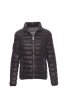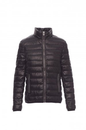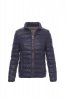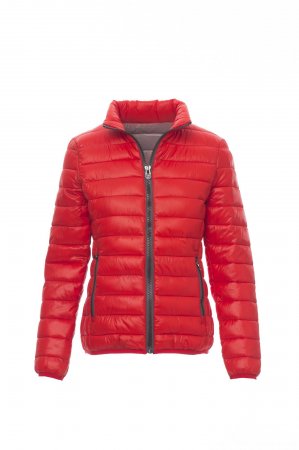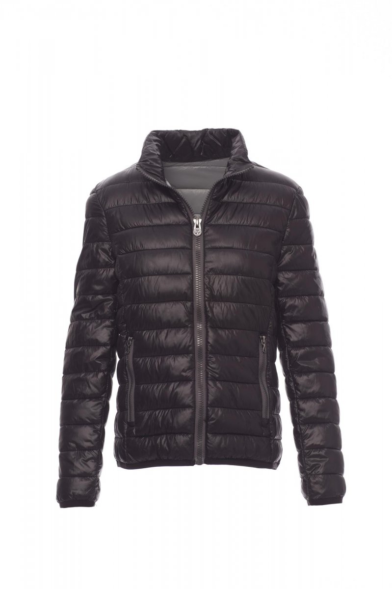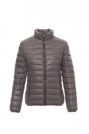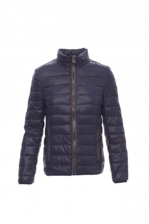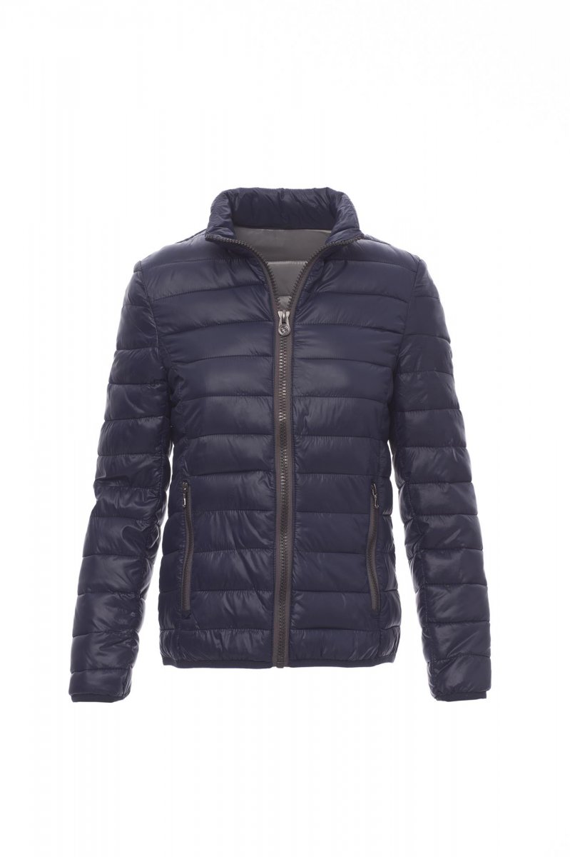 Women's down jacket with free-fibre padding (160g/m²), 8mm plastic zip with metal slider. Thin piping on cuffs and waist. Two external pockets with zip. Three internal pockets.