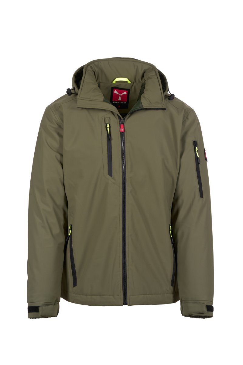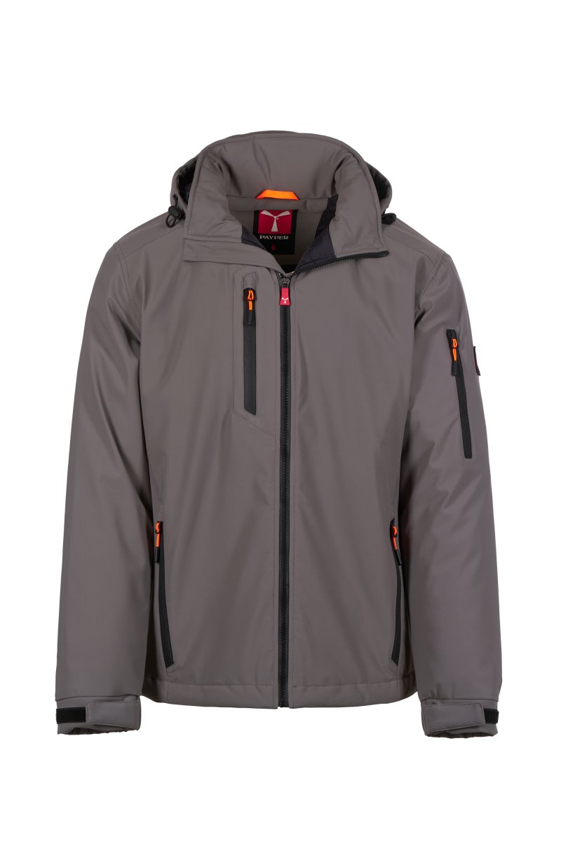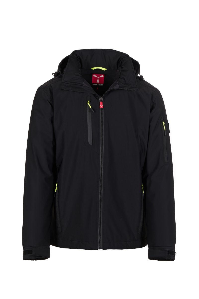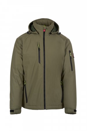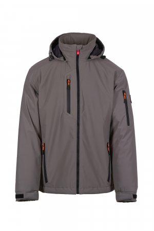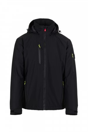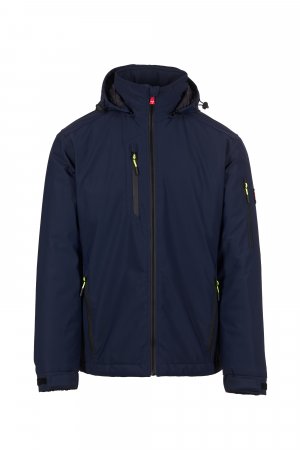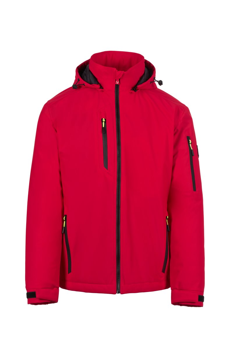 WP 8000 mm H₂O, WVT 5000 g/m² 24h. Men's 2-layer soft-shell with lightweight padding (100 g/m²), SBS zip closure with "semi-auto lock" metal slider and customised pull. Removable hood with adjustable drawstring. Retroreflective stripes on lower back and back of the hood. Elasticated cuffs, adjustable with hook-and-loop fastener. Two side pockets with zip, a chest pocket with coated zip and a pocket on the left arm with integrated pen holder, closed with a zip. Fluorescent pulls. One internal welt pocket with hook-and-loop fastener. Adjustable bottom with customised stoppers.