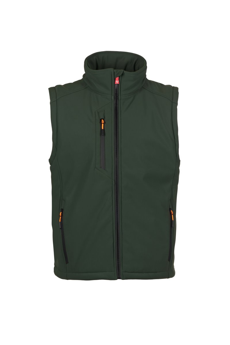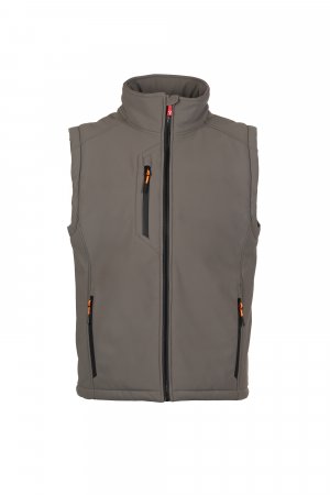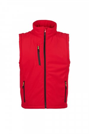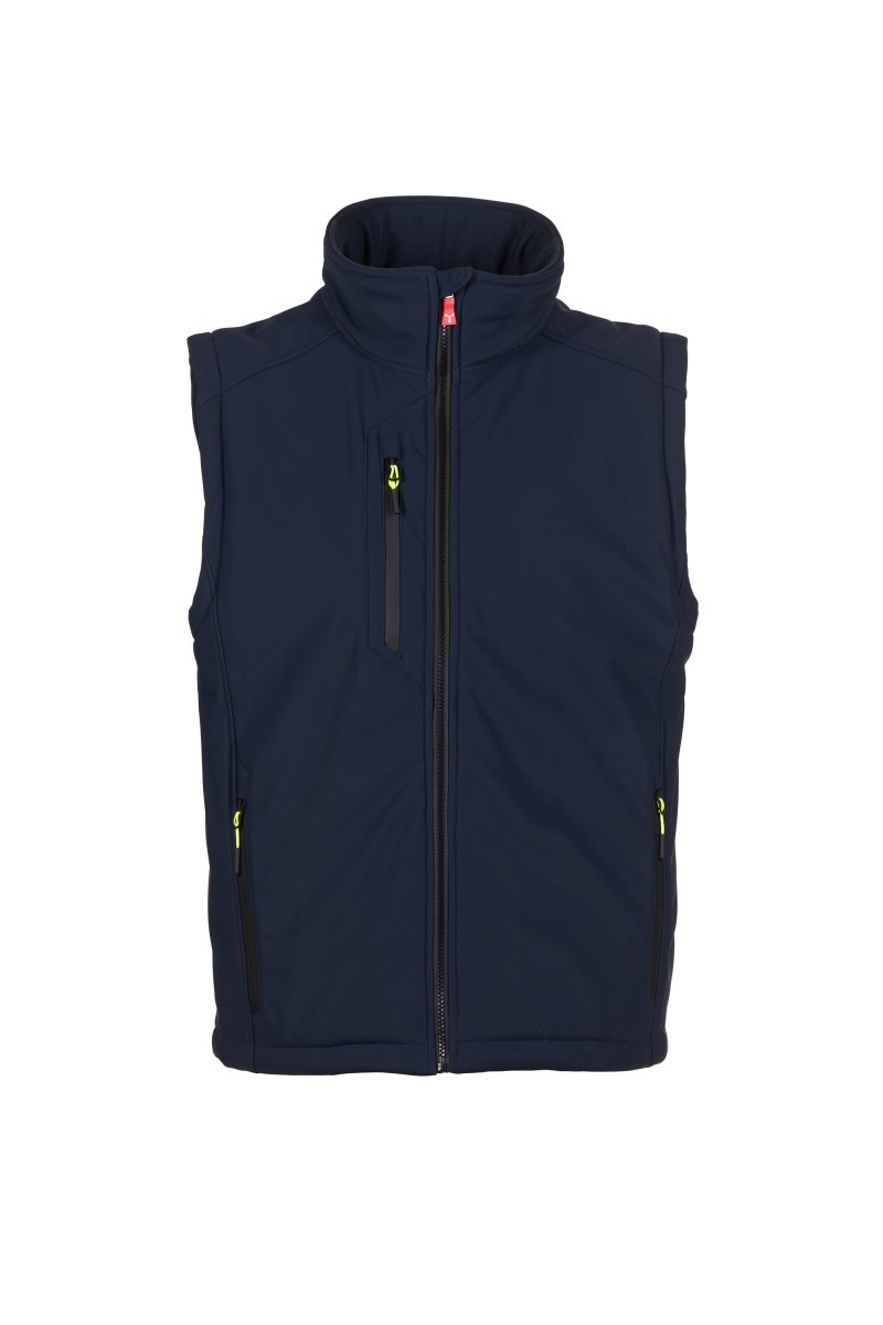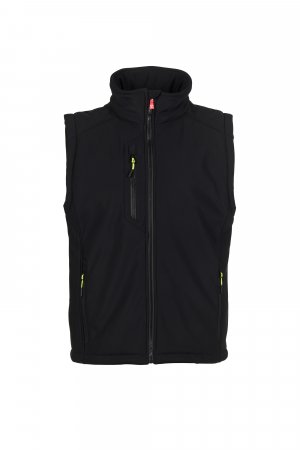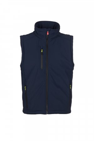 WP 8000 mm H₂O, WVT 5000 g/m² 24h. Men's 3-layer soft-shell vest with warm padding (160 g/m²), polar fleece inserts on the collar, SBS zip closure with “semi-auto lock” metal slider and customised pull. Inner collar with polar fleece side details. Retroreflective stripe on lower back. Two side pockets with zip, one chest pocket with coated zip. Fluorescent pulls. One inner welt pocket with hook-and-loop fastener. Adjustable bottom with customised stoppers.