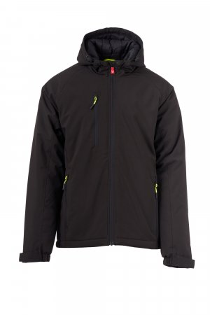 WP 8000 mm H₂O, WVT 5000 g/m² 24h. Men’s 2-layer soft-shell with medium padding (140 g/m²), zip closure with "semi-auto lock" metal slider and customised pull. Fixed hood with adjustable drawstring. Elasticated cuffs, adjustable with hook-and-loop fastener. Two side pockets and one chest pocket, closed with a zip. Fluorescent pulls. Two internal pockets: one shaped zip pocket and one tablet holder with hook-and-loop fastener. Adjustable bottom with customised stoppers.