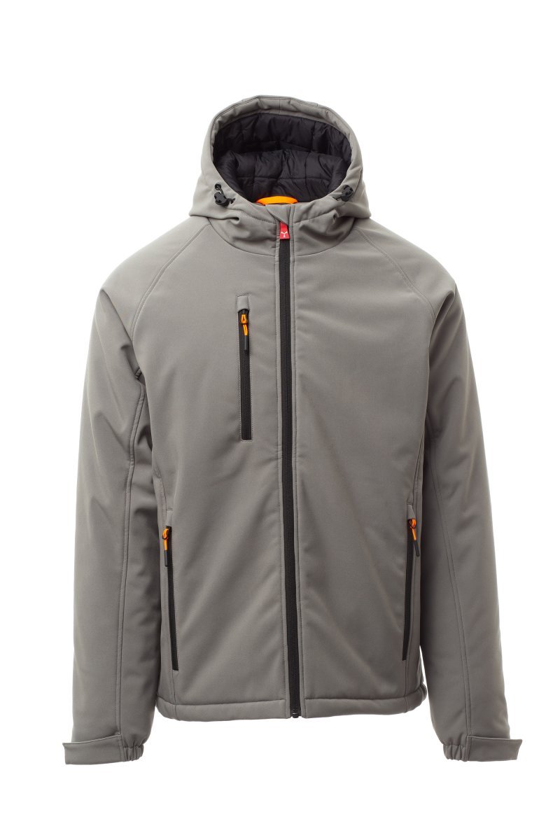 WP 8000 mm H₂O, WVT 5000 g/m² 24h. Men’s 3-layer soft-shell with warm padding (160 g/m²), zip closure with "semi-auto lock" metal slider and customised pull. Fixed hood with adjustable drawstring. Elasticated cuffs, adjustable with hook-and-loop fastener. Two side pockets and one chest pocket, closed with a zip. Fluorescent pulls. Two internal pockets: one shaped zip pocket and one tablet holder with hook-and-loop fastener. Adjustable bottom with customised stoppers.