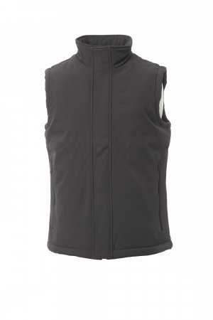 WP 8000 mm H₂O, WVT 5000 g/m² 24h. Men's 3-layer soft-shell vest with warm padding (160 g/m²) with hook-and-loop fastener and zip with “semi-auto lock” metal slider and customised pull. Two external pockets with coated zips, one internal welt pocket with hook-and-loop fastener, one internal tablet pocket with hook-and-loop fastener. Customised patch on the back of the neck, with retroreflective detail. Adjustable bottom with personalised stoppers.