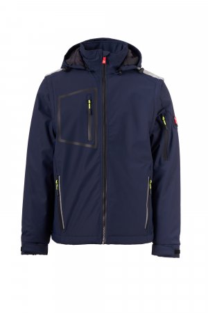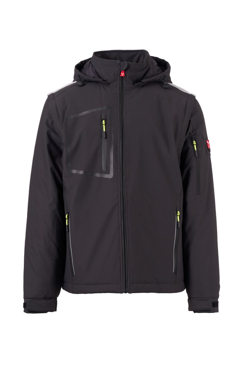 WP 8000 mm H₂O, WVT 5000 g/m² 24h. Men's 3-layer soft-shell with medium padding (140g/m²), detachable sleeves, SBS zip closure with "semi-auto lock" metal slider and customised pull. Removable hood with adjustable drawstring. Retroreflective stripes on shoulders, lower back and back of the hood. Elasticated cuffs, adjustable with hook-and-loop fastener and inner sleeve. Heat-sealed chest pocket, closed with coated zip. Two side pockets, closed with a zip with retroreflective detail. Left arm pocket with integrated pen holder, closed with a zip. Fluorescent pulls. Two internal pockets: one shaped zip pocket on the right chest and one tablet holder with hook-and-loop fastener on the left. Adjustable bottom with customised stoppers.
