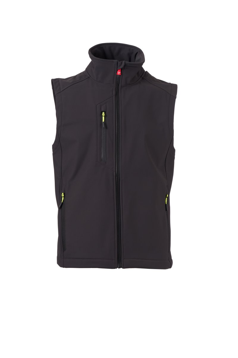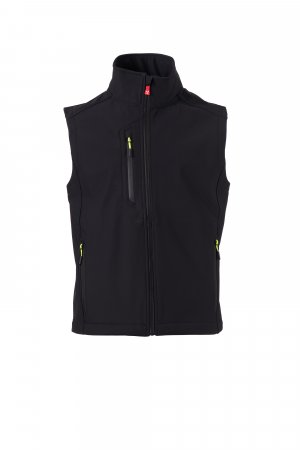 WP 8000 mm H₂O, WVT 5000 g/m² 24h. Men's 3-layer soft-shell vest with SBS zip closure with “semi-auto lock” metal slider and customised pull. Retroreflective stripes on lower back and back of the hood. Two side pockets with zip, a chest pocket with coated zip. Fluorescent pulls. One internal welt pocket with hook-and-loop fastener. Adjustable bottom with personalised stoppers.