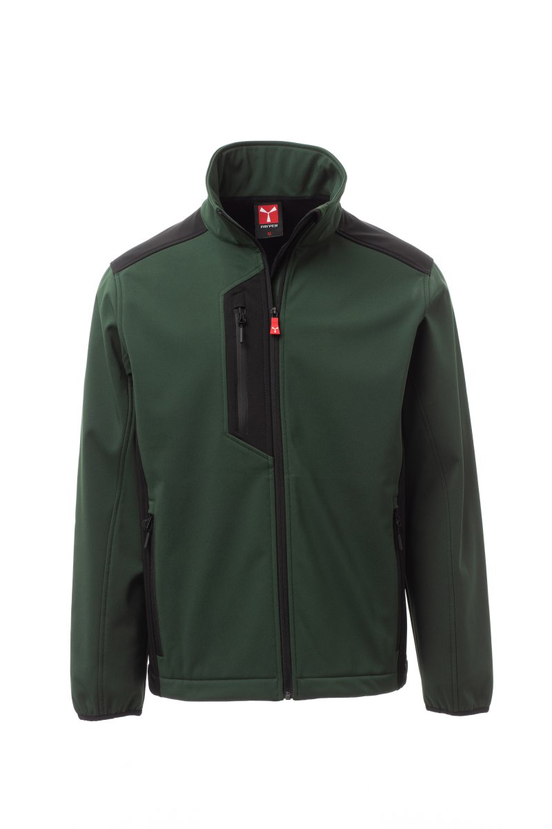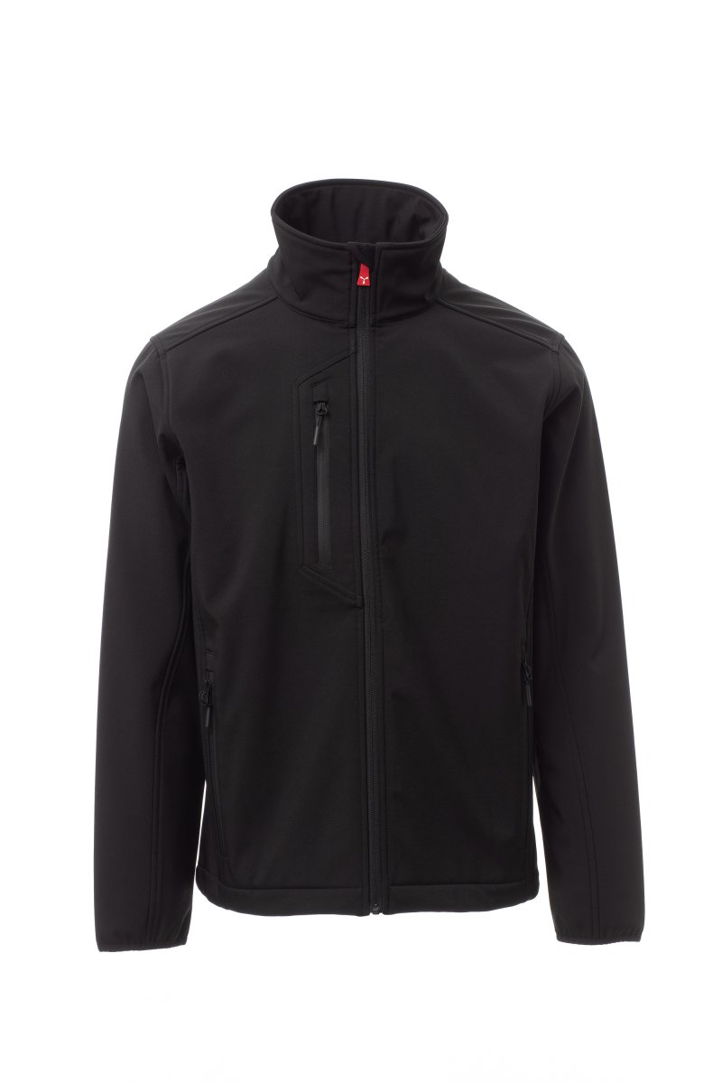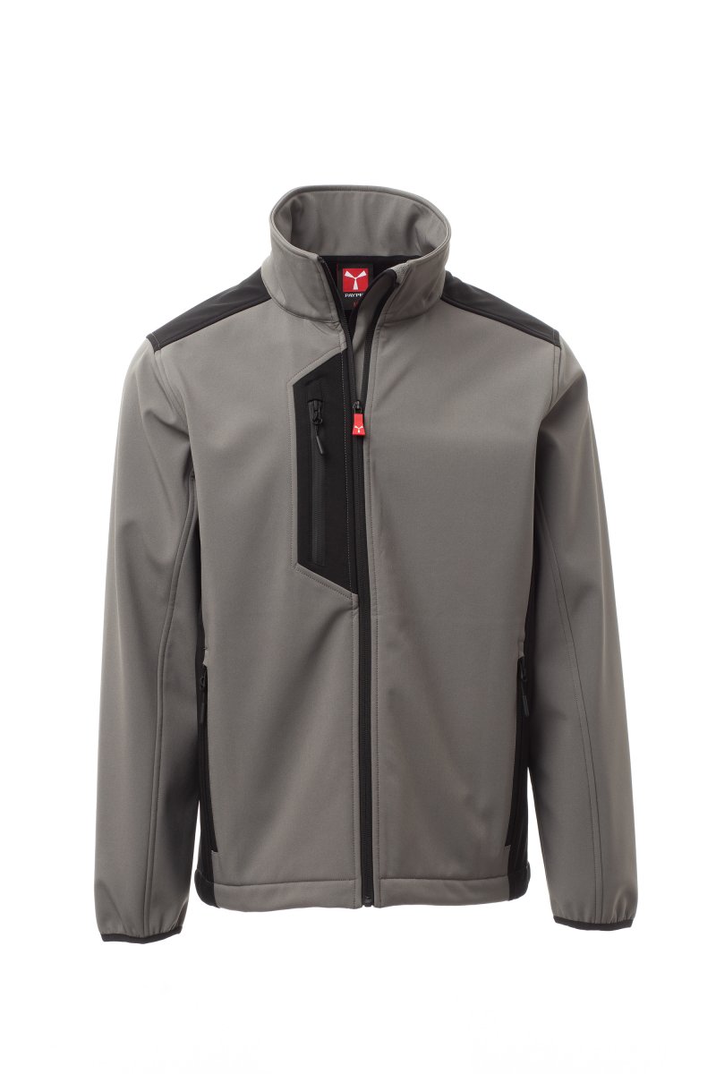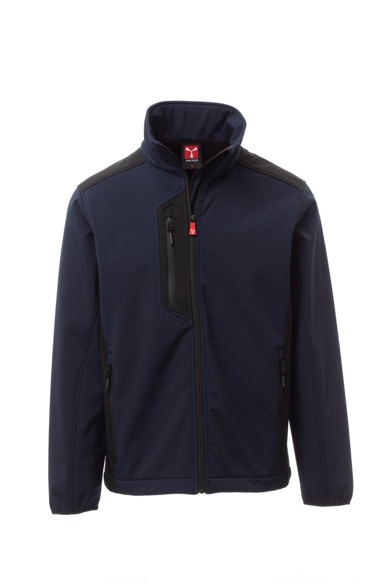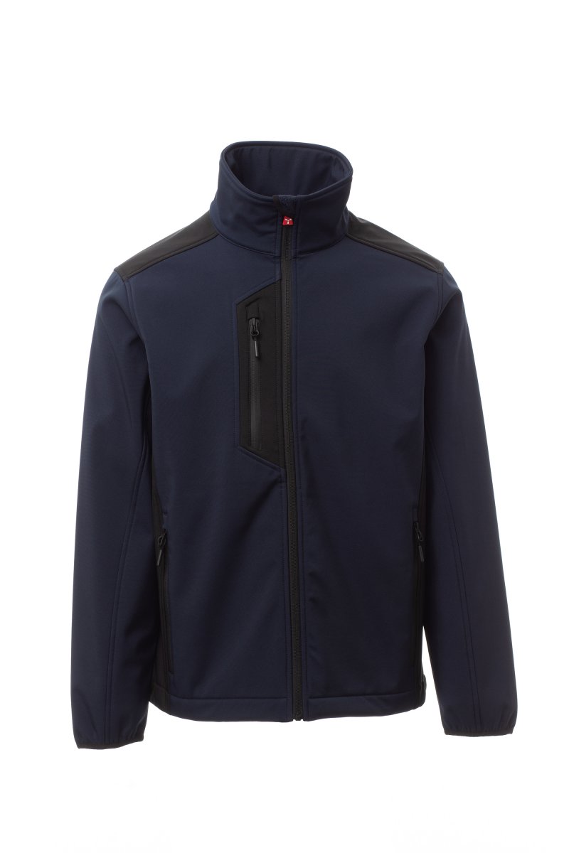 WP 8000 mm H₂O, WVT 5000 g/m² 24h. Men's 3-layer, two-tone soft-shell, zip closure with “semi-auto lock” metal slider and customised pull. Elasticated cuffs with edging. Two side pockets with zip, one chest pocket with coated zip. Retroreflective detail on the back yoke. Adjustable bottom with personalised stoppers.