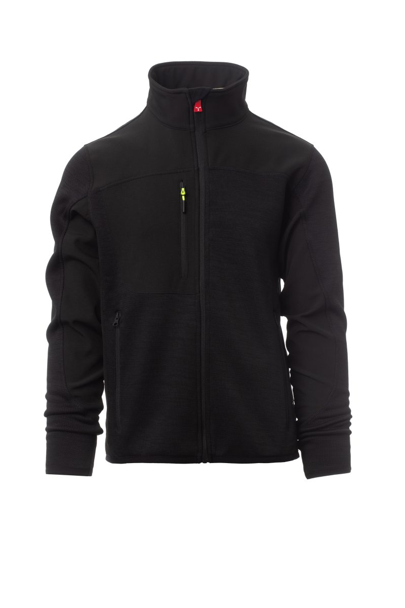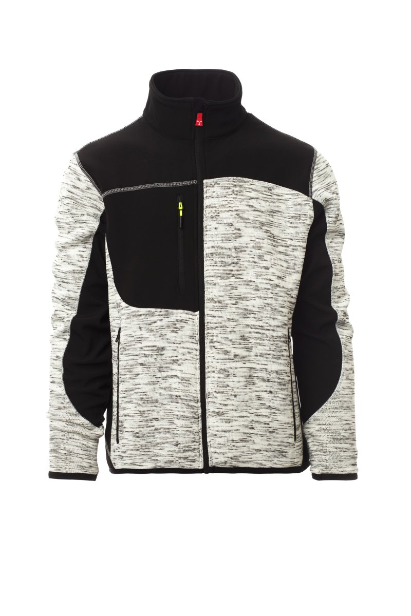 Technical sweater with contrasting soft-shell inserts, taped zip fastening, equipped with "semi-autolock" slider and customised pull. Finished piping on cuffs and bottom. 2 side pockets with zip, 1 shaped chest pocket with zip. Reflex detail on the back.
