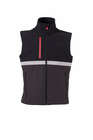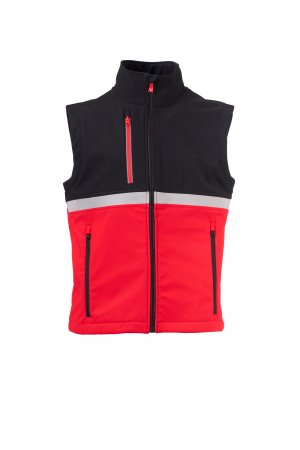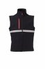WP 8000 mm H₂O, WVT 5000 g/m² 24h. Men's 3-layer soft-shell vest, polar fleece inserts on the collar, SBS zip closure with “semi-auto lock” metal slider and customised pull. Front retroreflective stripe on chest. Two side pockets with zip and a chest pocket with zip with retroreflective detail. "Life-saving" element on the back, with internal retroreflective logo, closed with a zip. An internal tablet pocket with hook-and-loop fastener. Breathable inner lining on the back. Adjustable bottom with customised stoppers.