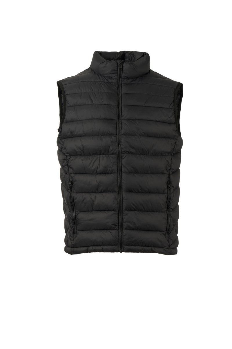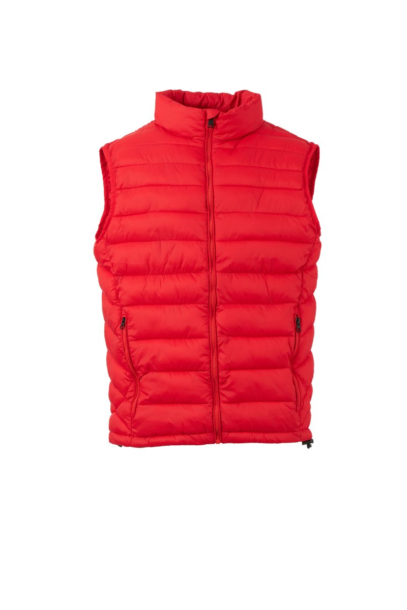 Men's vest with free-fibre padding (130g/m²), plastic zip with customised metal slider with propeller. Two side pockets with visible zip. Tone-on-tone piping. Adjustable bottom with drawstring. The garment can be stored inside the right side pocket.