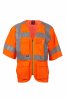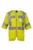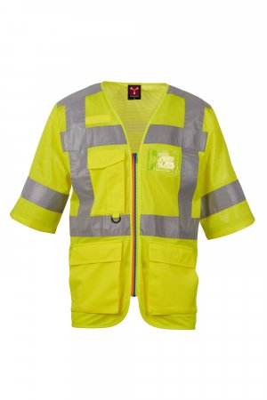 Unlined, short-sleeved high visibility vest made of breathable mesh in the upper part and dry-tech fabric in the lower part, with horizontal retroreflective stripes on the shoulders, chest and waist and two vertical retroreflective stripes. SBS zip closure, with two-tone tape. Fixed badge holder on the left chest when worn. When worn: multipurpose loop, a pen holder pocket with hook-and-loop fastener and a ring on the right chest. Two external bellow pockets with hook-and-loop fastener in the upper part and side opening.